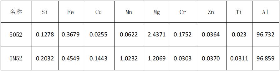 5052鋁合金化學成分當中除Si、Fe、Cu、Mn、Zn元素不另行添加以外,其主要添加元素為Mg起主要的強化作用,添加少量的Cr和Ti元素起一定的晶粒細化作用;5M52鋁合金化學成分中其降低一部分Mg含量,添加部分Mn元素使材料強度、再結晶溫度、合金密度得到提升,因密度略微的增加耐腐蝕將比5052合金效果更加突出。